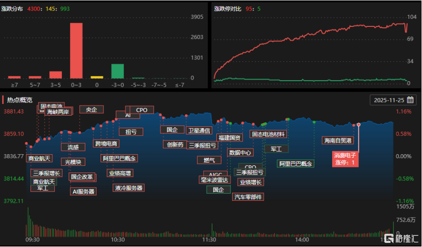 11月25日,沪指涨0.87%,深成指涨1.53%,创业板指涨1.77%。全市场成交额1.83万亿元,4300只个股上涨,95只个股涨停。游戏、AI应用、CPO、贵金属 等板块涨幅居前,军工装备、养殖板块下跌。 | 代码 | 名称 | 价格 | 涨跌 | 涨幅↓ | 换手% 几天几板12 ... | 成交额 | 成交量 涨停分析 | | --- | --- | --- | --- | --- | --- | --- | --- | | 301117 | 佳绿科技 | 48.17 | +8.03 | +20.00% | 35.99% 首板涨停 | 13.22 乙 | 28.59万 商业航天+网络 | | 300620 | 光库科技 | 147.00 +24.50 | | +20.00% | 19.11% 自板涨停 | 65.45 7. | 47.21万 重大资产重组 | | 300437 | 清水源 | 18.66 | +3.11 | +20.00% | 30.79% 首板涨停 | 9.01 Z, | 54.13万 水处理剂+磷 | | 688502 | 德科立 | 142.56 +23.76 | | +20. ...