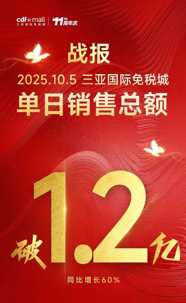 校对 卢茜 编辑 王真真 新京报贝壳财经讯 10月6日,据中国旅游集团公众号消息,国庆中秋假期,海南作为热门旅游目的地, 热度不断攀升。10月5日,中国旅游集团旗下cdf三亚国际免税城单日销售额突破1.2亿元。 ...