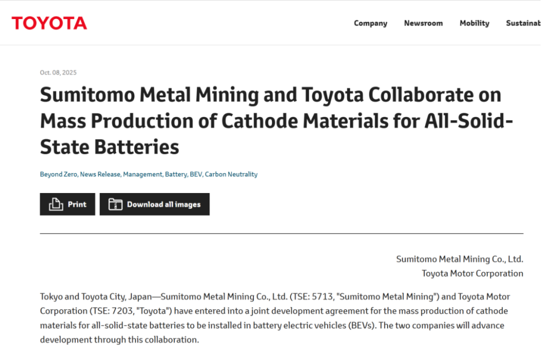 来源:上海证券报 10月8日,丰田汽车全球官网发布消息称,住友金属矿山株式会社(以下简称"住友金属矿山")与丰田汽车就量产用于纯电动汽车(BEV)的全固态电池 正极材料达成合作协议。双方将通过此次合作推进研发进程。丰田汽车还在文内重申,计划于2027年至2028年间推出搭载全固态电池的纯电动汽车。 丰田汽车方面分析,全固态电池主要由正极、负极和固体电解质构成。作为下一代电池技术,全固态电池相较于当前使用液态电解液的传统电池,具有体 积更小、输出功率更高、寿命更长的潜力。应用于纯电动汽车时,全固态电池有望带来续航里程更长、充电时间更短、输出功率更高的性能提升。 2021年左右起,住友金属矿山便与丰田汽车围绕全固态电池正极材料展开联合研究,重点攻克反复充放电循环过程中正极材料劣化等难题。 为此,双方依托住友金属矿山独有的粉末合成技术(powder synthesis technology),成功开发出适用于全固态电池的新型"高耐久性正极材料"。 凭借在为各类电动汽车供应正极材料方面积累的超过20年经验,住友金属矿山致力于供应这款新开发的正极材料,并推动其实现量产。 图片:全固态电池结构示意图来源:丰田汽车全球官网 ...