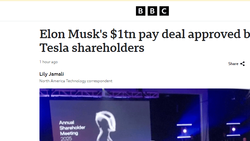 Core Points - Tesla's CEO Elon Musk has received shareholder approval for a potential compensation plan valued at nearly $1 trillion, with a 75% voting support rate [1] - Musk celebrated the approval on stage, highlighting the strong backing from retail investors despite opposition from major institutional investors [4] Summary by Sections Compensation Plan - The plan requires Musk to achieve two main goals over the next decade: increase Tesla's current market value of $1.4 trillion to $8.5 trillion and commercialize 1 million Robotaxi vehicles [4] - Upon meeting these targets, Musk could receive hundreds of millions of new stock shares [4] Shareholder Dynamics - Significant opposition to the plan came from large institutional investors such as the Norwegian sovereign wealth fund and the California Public Employees' Retirement System [4] - Previous compensation proposals faced legal challenges due to perceived close ties between Musk and the board, leading to Tesla's relocation to Texas [4] Business Focus - During the shareholder meeting, Musk emphasized the Optimus robot and did not initially mention the electric vehicle business, disappointing some analysts [4] - He later addressed full self-driving (FSD) capabilities, despite ongoing investigations by U.S. regulators into accidents related to Tesla's autonomous driving features [4] Analyst Insights - Analyst Dan Ives stated that Musk is Tesla's "most valuable asset" and that the company's AI valuation is expected to be unlocked, potentially shifting to an AI-driven valuation model in the next 6-9 months [4]