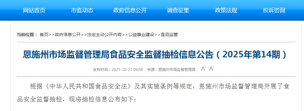 湖北省恩施州市场监督管理局食品安全监督抽检信息公告(2025年第14期)