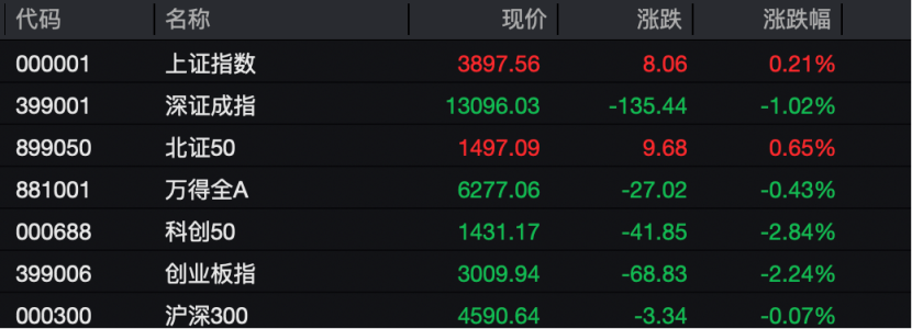冲高回落。 今天(10月14日)上午,A股市场跳空高开后冲高回落,科技股大幅调整,拖累市场人气,多只半导体相关ETF跌幅超过5%。大金融板块走强,成为上午A股 市场主要亮点之一。 | 代码 | 名称 | 现价 | 涨跌 | 涨跌幅 | | --- | --- | --- | --- | --- | | 000001 | 上证指数 | 3897.56 | 8.06 | 0.21% | | 399001 | 深证成指 | 13096.03 | -135.44 | -1.02% | | 899050 | 北证50 | 1497.09 | 9.68 | 0.65% | | 881001 | 万得全A | 6277.06 | -27.02 | -0.43% | | 000688 | 科创50 | 1431.17 | -41.85 | -2.84% | | 399006 | 创业板指 | 3009.94 | -68.83 | -2.24% | | 000300 | 沪深300 | 4590.64 | -3.34 | -0.07% | 行业板块和赛道方面,大金融走强,其中银行板块涨幅超过2%,重庆银行、厦门银行、江苏银行、 ...