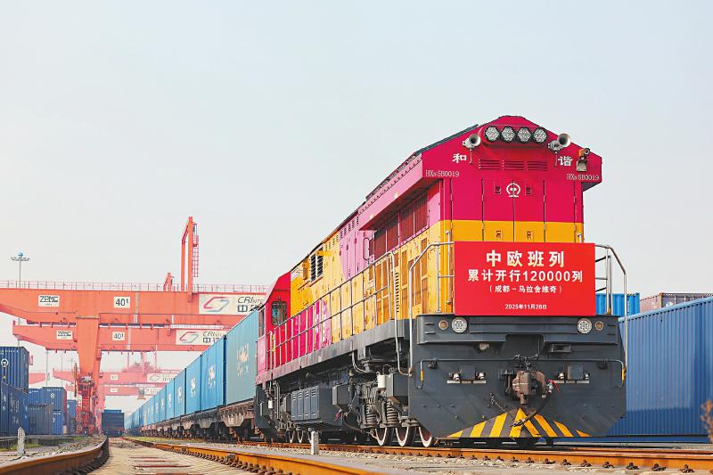 中欧班列第12万列从成都国际铁路港始发 中新网成都11月28日电 (记者 张浪)28日,一列满载55个集装箱的中欧班列从位于成都国际铁路港鸣笛 启程,标志着中欧班列累计开行量正式突破12万列。这趟承载着"四川造"产品与跨境电商货物的班列, 经阿拉山口口岸出境后,将在波兰马拉舍维奇完成分拨,最终把货物送达德国杜伊斯堡、法国里昂、比 利时安特卫普等欧洲重要城市,为欧亚贸易往来再添新动能。 一列满载55个集装箱的中欧班列从成都国际铁路港鸣笛启程。成都国际铁路港供图 作为共建"一带一路"的重要载体和西部对外开放的核心枢纽,成都中欧班列积极推进川渝开放发展,加 快构筑向西开放战略高地和参与国际竞争新基地,以打造"国际门户枢纽"、高质量服务"一带一路"产业 发展为目标,持续拓展亚蓉欧国际物流通道新站点,创新特色班列产品,不断增强国际供应链链接能 力,为全球产业链供应链稳定提供坚实保障。 自2013年首趟中欧班列(蓉欧快铁)开行以来,13年间成都国际班列实现跨越式发展:年度开行量从2013 年的31列飙升至2024年的超5000列,累计开行量突破3.6万列,成功联接境外132个城市和境内30余个城 市,构建起覆盖欧亚大陆的 ...
