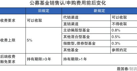 (来源:中国消费者报) | | 旧规定 | 新规定 | | | --- | --- | --- | --- | | 收费要求 | 可以收取 | 代销渠道 | 可以收取 | | | | 直销渠道 | 不得收取 | | 收费上限 | 5% | 主动偏股型基金 | 0.8% | | | | 其他混合型基金 | 0.5% | | | | 指数型、债券型基金 | 0.3% | | | | 其他基金 | 参照约定 | | 后端收费 豁免要求 | 持有期限≥3年 | 持有期限>1年 | | ■本报记者 聂国春 继降低基金管理费、托管费,调降交易佣金费率后,公募基金的销售费率也下降了。1月1日起,《公开 募集证券投资基金销售费用管理规定》(以下简称《规定》)正式施行,标志着自2023年以来启动的公 募基金行业费率改革工作正式收官。业内测算,《规定》落地后每年将为投资者降费约300亿元,加上 前两个阶段的让利举措,公募基金综合费率水平下降约20%,每年总让利达510亿元。 分类分层降费 向"买方服务"转型 《规定》通过机制设计,不仅将为投资者每年节省数百亿元的投资费用,还将重塑基金销售生态,引导 行业回归"受人之托、代人理财" ...