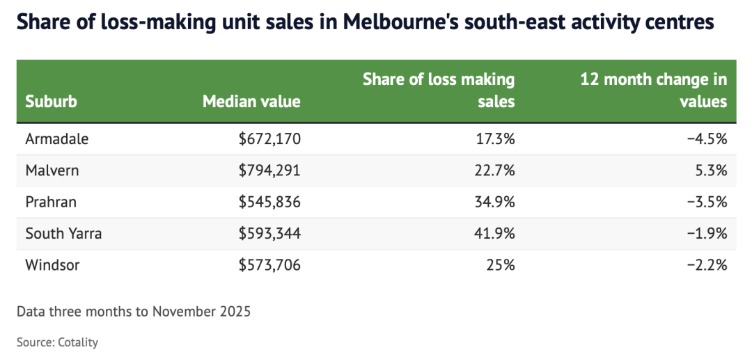 这笔账算不过来了 墨尔本内东南多个被列入 "高密度发展" 计划的热门区域, 近期出现大量公寓亏本出售的情况。 数据显示: 部分区域亏损成交比例高达42%,引发业内对未来高层项目可行性的担忧。 维州政府已将Armadale、Malvern、Prahran、South Yarra和Windsor纳入60个 "交通活动中心" 名单, 鼓励在火车站和电车线路周边建设更高密度住宅。 其中,Malvern、Prahran和South Yarra部分地段允许最高16层建筑, Armadale和Windsor部分区域则可建至10层。 不过,房地产研究机构Cotality的最新数据显示: 这些区域不少公寓正以低于买入价出售。 2025年11月前三个月,South Yarra有41.9%的公寓成交为亏损, Prahran为34.9%。Windsor亏损比例为25%,Malvern为22.7%,Armadale为17.3%。 | | | Share of loss making | 12 month change in | | --- | --- | --- | --- | | Suburb | Median value | sa ...