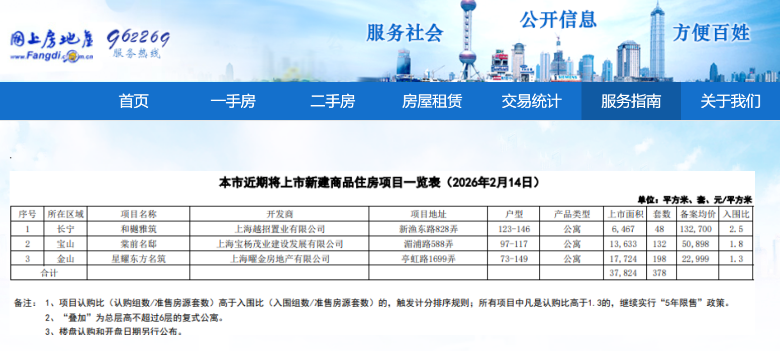 3个楼盘共推出378套房,产品类型均为公寓。 备案均价最高13.27万元/㎡,最低2.3万元/㎡。 | 序号 所在区域 | | 项目名称 | 开发商 | 项目地址 | 户型 | | --- | --- | --- | --- | --- | --- | | | 长宁 | 和樾雅筑 | 上海越招置业有限公司 | 新渔东路828弄 | 123-146 | | 2 | 宝山 | 業前名邸 | 上海宝杨茂业建设发展有限公司 | 湄浦路588弄 | 97-117 | | 3 | 金山 | 星耀东方名筑 | 上海曜金房地产有限公司 | 亭虹路1699弄 | 73-149 | | 合计 | | | | | | 上海进深 赵盼盼 2月14日,网上房地产官网公示了近期即将入市的新房名单,覆盖长宁、宝山、金山三个区域。 其中,位于长宁的和樾长宁(备案名:和樾雅筑)加推48套房源,户型面积为建面约123-146㎡,备案均价13.27万元/㎡; 宝山的金茂棠前(备案名:棠前名邸)再推132套房源,户型面积为建面约97-117㎡,备案均价约5.09万元/㎡; 金山的新华星耀东方(备案名:星耀东方名筑)推出198套房源,户型面积为建面约 ...