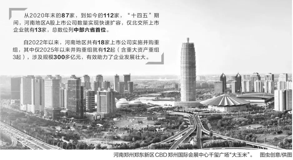 河南郑州郑东新区CBD郑州国际会展中心千玺广场"大玉米"。 图虫创意/供图 证券时报记者 赵黎昀 资本市场作为国民经济的晴雨表,既是观察实体经济运行活力和产业结构调整动向的重要窗口,也是通 过资源配置为行业企业提质升级赋能的源头活水。站在"十四五"末尾,回望过去五年中部大省河南的经 济发展脉络,资本市场的"助推器"作用愈发凸显。 "十四五"期间,从区域内上市公司数量稳步攀升,到牧原股份、双汇发展等龙头企业依托资本市场巩固 行业地位,再到仕佳光子、新强联等科技型企业借助上市融资突破技术瓶颈,河南资本市场正从"量的 积累"向"质的提升"跨越,不仅为粮食生产核心区、先进制造业强省建设注入了金融动能,更让"豫企军 团"在全国资本市场的版图中占据一席之地。 面向"十五五",以"智能化、绿色化、高端化"为方向,河南"7+28+N"产业链集群将迎来更大发展空 间。围绕"两高四着力"精神内核,河南也将着力服务科技创新和产业创新融合,提升上市公司质量和产 业投融资,助力全省经济高质量发展。 资本赋能: 产业智能化加速升级 作为资本市场资源配置的基础性功能,场内资金活水正源源不断注入实体企业,助力豫企完成技术升 级,推动战略产业 ...