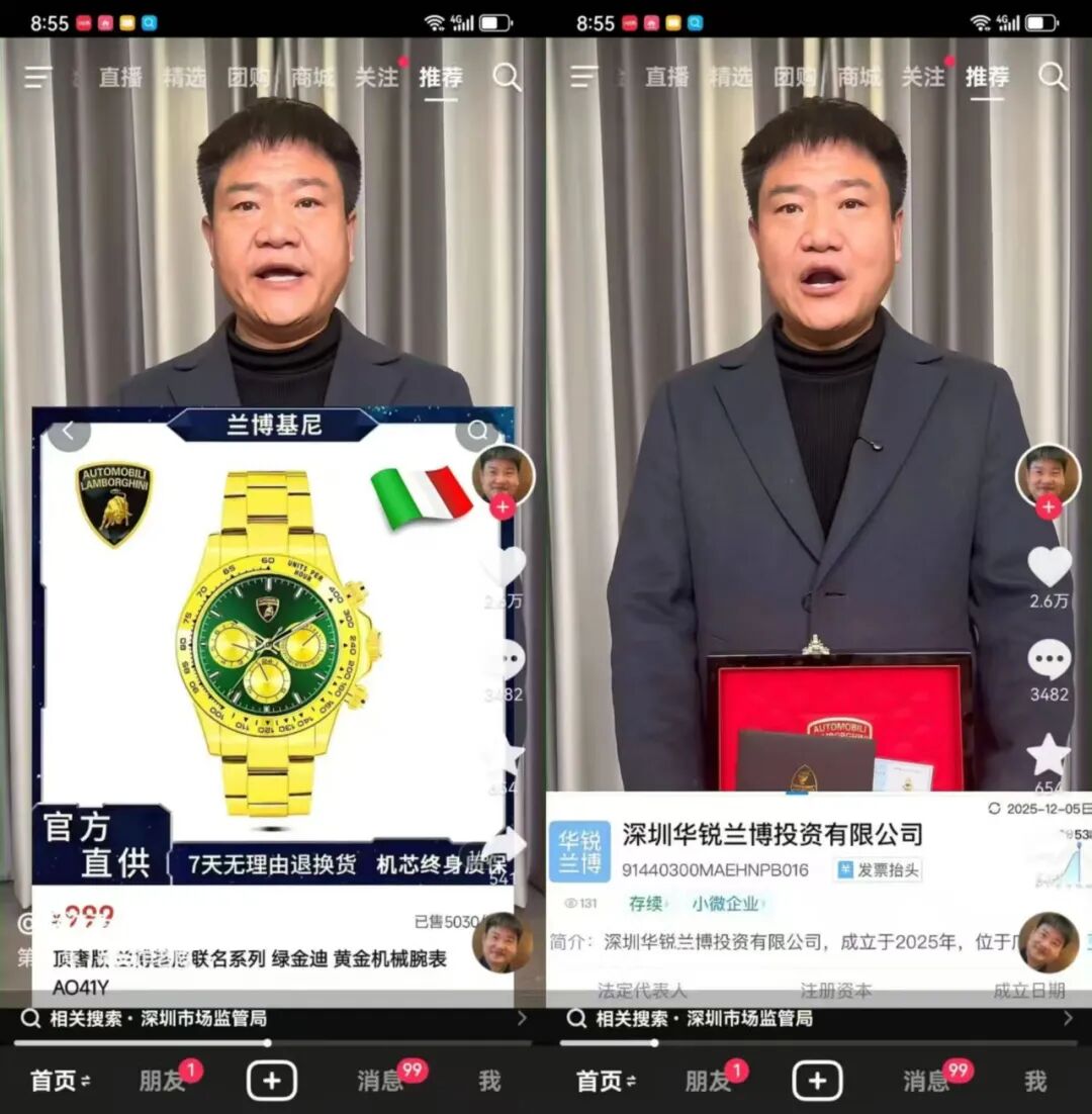 近日,百万粉丝网红"反诈老陈的故事"在个人社交平台发布视频,公开质疑其通过某平台直播间购买 的"兰博基尼联名黄金手表"涉嫌为假冒产品,引发公众关注。 视频中展示的手表标价1980元,表身印有"999足金"字样,并附有一张"鉴定证书",直播间导购展示的 收据上还盖有"兰博基尼售后专用章"红章。 执法人员根据线索进一步排查,在辖区内发现一家涉嫌生产销售"兰博基尼联名手表"的企业。现场检查 中,查获一批无厂名厂址、无产品执行标准的手表,执法人员依法对相关产品予以扣押。目前,市场监 管部门正就涉事企业与华锐兰博公司之间的关联合作展开深入调查。 此事也引发公众对网络直播购物中商品真伪与质量保障的关注。市场监管部门提醒消费者,在网络平台 购买商品,特别是涉及知名品牌联名或高价商品时,应注意核查商家资质、产品合格证明及售后服务信 息,保留好交易凭证,如遇问题及时通过正规渠道维权。 深圳市市场监督管理局表示,将继续依法打击制售假冒伪劣商品行为,维护市场秩序和消费者合法权 益。 "反诈老陈的故事"视频中指出,售卖该手表的深圳华锐兰博公司涉嫌利用消费者对国际品牌的信任,以 低价诱导购买,实际产品价值与宣传严重不符,属于"三无产品 ...