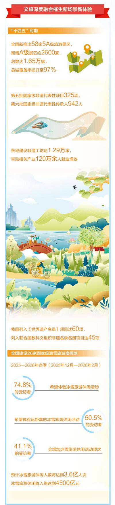 数据来源:文化和旅游部等 文化和旅游深度融合发展,对满足人民美好生活需要、赋能经济社会发展、建设文化强国和旅游强国具 有重要意义。良渚遗址溯源文明根脉,三星堆文物彰显古蜀瑰丽,英歌舞、簪花围等非遗焕发新生…… 一系列文旅深度融合发展的鲜活实践,勾勒出"诗和远方"相得益彰、浑然一体的蓬勃图景,更好地满足 了人民群众对美好生活的期待。 "十五五"规划建议提出,"推进文旅深度融合,大力发展文化旅游业,以文化赋能经济社会发展。"坚 持"以文塑旅、以旅彰文",推动文旅融合向更深层次迈进,让文化自信浸润生活、凝聚力量,为美好生 活持续添彩,为民族复兴注入精神动能。 ——编 者 山西恒山风景名胜区管理中心悬空寺景区负责人麻斌 "悟空"带火古建游 "壮观!"元旦假期,山西大同浑源县恒山悬空寺前,游客们驻足最佳拍照点,望着崖壁间的千年古建, 不时发出由衷赞叹。始建于北魏、现存主体为明清遗存的悬空寺,是中国古代建筑艺术的杰作。 步入金龙峡谷,翠屏峰西侧崖壁腰间,三层古楼阁静静伫立。斗拱飞檐仿佛是从崖壁中"生长"而出,只 有碗口粗的一排木柱凌空支撑,上载危岩、下临深谷。走廊上,游客如长龙,望着这座"空中楼阁"的奇 险精巧,让每个人 ...
