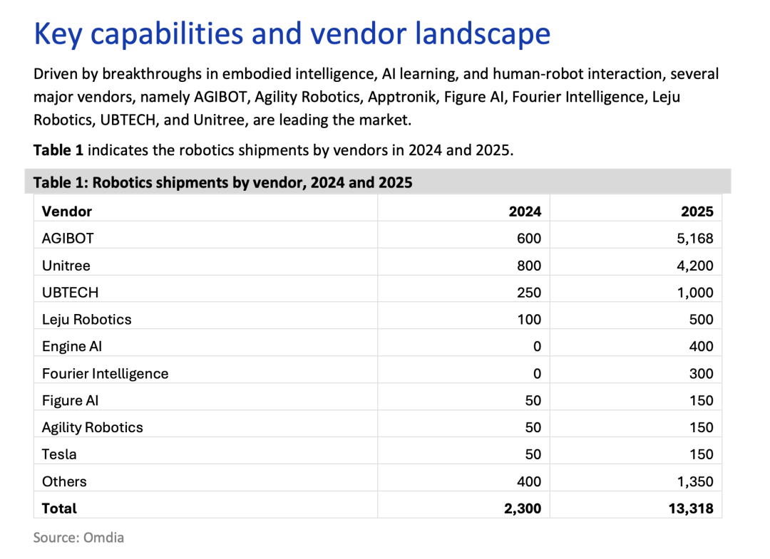 近日,全球权威市场研究机构Omdia发布《通用具身机器人市场雷达》报告。 报告显示,中国厂商在规模化量产与出货量方面表现突出,其中智元以超过5100台的年度出货量,占据全球39%的市场份额,在出货量与市场份额两项关 键指标上均位居全球第一。 报告统计,2025年全球人形机器人出货量前六名均为中国企业,分别是智元、宇树科技、优必选、乐聚机器人、众擎机器人、傅利叶,六家中国企业2025 年出货量占全球86.9%。随后是美国机器人公司Figure AI、Agility Robotics、Tesla。 | Table 1: Robotics shipments by vendor, 2024 and 2025 | | | | --- | --- | --- | | Vendor | 2024 | 2025 | | AGIBOT | 600 | 5,168 | | Unitree | 800 | 4,200 | | UBTECH | 250 | 1,000 | | Leju Robotics | 100 | 500 | | Engine Al | 0 | 400 | | Fourier Intelligence | 0 ...
