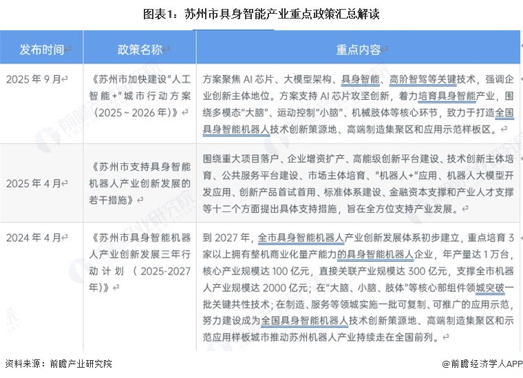 转自:前瞻产业研究院 1、苏州市具身智能产业政策环境 ——苏州市具身智能产业重点政策梳理 苏州市已构建起系统化的具身智能产业政策体系,以《三年行动计划》明确百亿产业规模与关键技术突破目 标,以《若干措施》提供从技术研发到应用推广的全链条专项支持,并最终在《"人工智能+"城市行动方 案》中将其提升为城市级战略,清晰展现了从产业规划到生态构建的纵深推进路径。 ——苏州市具身智能产业各区域政策 苏州市在具身智能产业领域已形成清晰的区域分工:苏州工业园区作为核心策源地,系统布局整机、关键技 术及核心部件,并设定了明确的产业规模目标;吴中区则聚焦应用生态培育,通过平台建设、场景开放与资 金补助等方式强化产业支撑,两者共同构建起从技术研发到市场应用的协同发展格局。 | 区域 | 政策名称 | 重点内容 | | --- | --- | --- | | 苏州工业园区( | 《苏州工业园区具身智能 | 园区将重点布局具身智能整机、智能系统关键技术和核心部组件等三大方 | | | 机器人产业发展行动计划 | 向,高水平建设中新具身智能产业园,着力打造具身智能机器人本体制造 | | | (2025-2027年)》 e | 集聚区、 ...