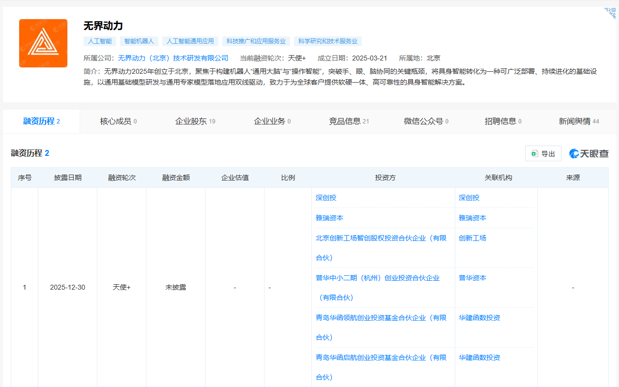 | 无界动力 人工智能 智能机器人 人工智能通用应用 科技推广和应用服务业 科学研究和技术服务业 | | --- | | 所属公司:无界动力(北京)技术研发有限公司 当前融资轮次:天使+ 成立日期:2025-03-21 所属地: 北京 | | 简介:无界动力2025年创立于北京,聚焦于构建机器人"通用大脑"与"操作智能",突破手、眼、脑协同的关键瓶颈,将具身智能转化为一种可广泛部署, | | 施,以通用基础模型研发与通用专家模型落地应用双线驱动,致力于为全球客户提供软硬一体、高可靠性的具身智能解决方案, | | 融資 7 程 2 | | 核心成员 0 | 企业股东 1a | | 企业务 0 | 竞品信息 21 微信公众号 0 | 招聘信息 0 | | --- | --- | --- | --- | --- | --- | --- | --- | | 融资历程 2 | | | | | | | ि | | 序号 | 披露日期 | 融资轮次 | 融资金额 | 企业估值 | 比例 | 投资方 | 关联机构 | | | | | | | | 深创投 | 深创投 | | | | | | | | 雅瑞资本 | 雅瑞资本 | ...
