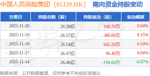 | 交易日 | 持股总数 (股) | 持股变动(股) | 变动幅度 | | --- | --- | --- | --- | | 2025-11-20 | 26.58亿 | 100.70万 | 0.04% | | 2025-11-19 | 26.57亿 | 386.00万 | 0.15% | | 2025-11-18 | 26.54亿 | 645.20万 | 0.24% | | 2025-11-17 | 26.47 乙 | 96.40万 | 0.04% | | 2025-11-14 | 26.46/Z | -194.60万 | -0.07% | 证券之星消息,11月20日南向资金增持100.7万股中国人民保险集团(01339.HK)。近5个交易日中,获 南向资金增持的有4天,累计净增持1033.7万股。近20个交易日中,获南向资金减持的有10天,累计净 减持1551.8万股。截至目前,南向资金持有中国人民保险集团(01339.HK)26.58亿股,占公司已发行 普通股的30.45%。 中国人民保险集团股份有限公司是一家主要提供保险产品的控股公司。该公司及其子公司主要从事财产 保险、健康保险、人寿保险、再保险、香 ...