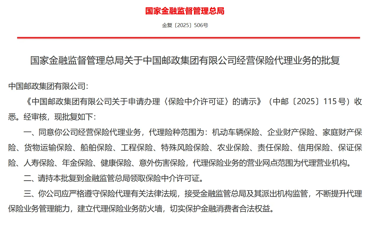 批复要求,中国邮政集团有限公司应严格遵守保险代理有关法律法规,接受金融监管总局及其派出机构监管,不断提升代理保险业务管理能力,建立代理保 险业务防火墙,切实保护金融消费者合法权益。 11月24日,国家金融监督管理总局发布批复,同意中国邮政集团有限公司经营保险代理业务,代理险种范围为:机动车辆保险、企业财产保险、家庭财产保 险、货物运输保险、船舶保险、工程保险、特殊风险保险、农业保险、责任保险、信用保险、保证保险、人寿保险、年金保险、健康保险、意外伤害保险, 代理保险业务的营业网点范围为代理营业机构。 (国家金融监督管理总局) ...