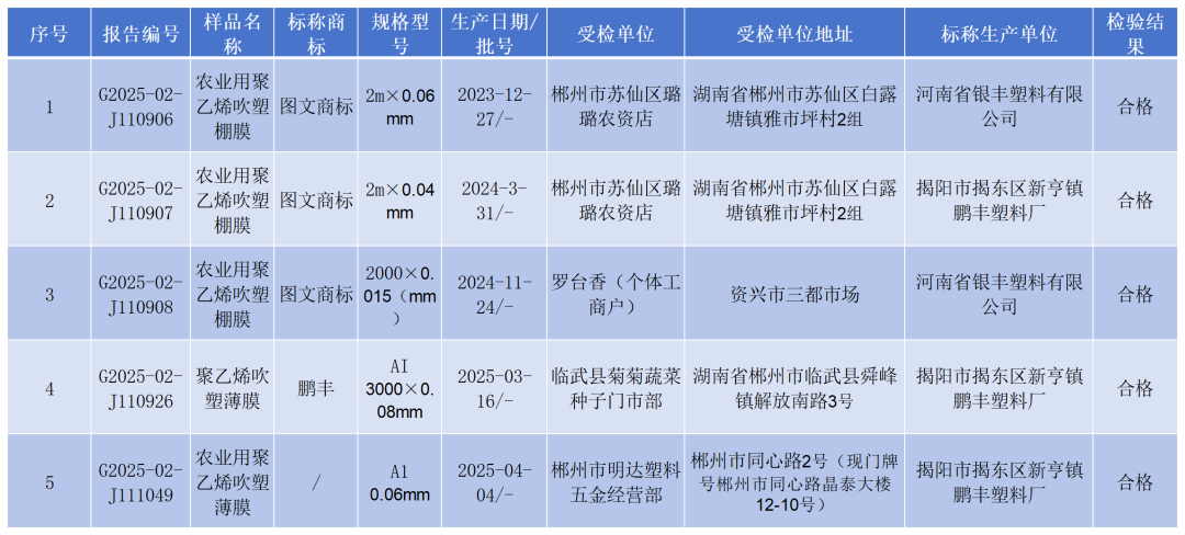 2025年度,郴州市市场监督管理局依据《中华人民共和国产品质量法》《产品质量监督抽查管理暂行办法》的相关规定,对全市流通领域的农用薄膜产品 质量进行了监督抽查。农用薄膜产品检验项目主要包括厚度极限偏差、厚度平均偏差、拉伸强度、断裂标称应变、直角撕裂强度、透光率、雾度等关键指 标。本次共抽检农用薄膜产品5批次,经检验全部合格。 下一步,我局将继续加强农资产品质量监管工作,充分发挥市场监管职能,提高产品质量监管效能,净化市场消费环境,确保产品质量安全。 | 序号 | 报告编号 | 样品名 | 标称商 | 规格型 | 生产日期/ | 受检单位 | 受检单位地址 | 标称生产单位 | 检验结 | | --- | --- | --- | --- | --- | --- | --- | --- | --- | --- | | | | 称 | 标 | 급 | 批号 | | | | 果 | | | G2025-02- | 农业用聚 | 乙烯吹塑 图文商标 | 2m×0.06 | 2023-12- | | 郴州市苏仙区路 湖南省郴州市苏仙区白露 | 河南省银丰塑料有限 | 合格 | | | 1110906 | | | mm | ...