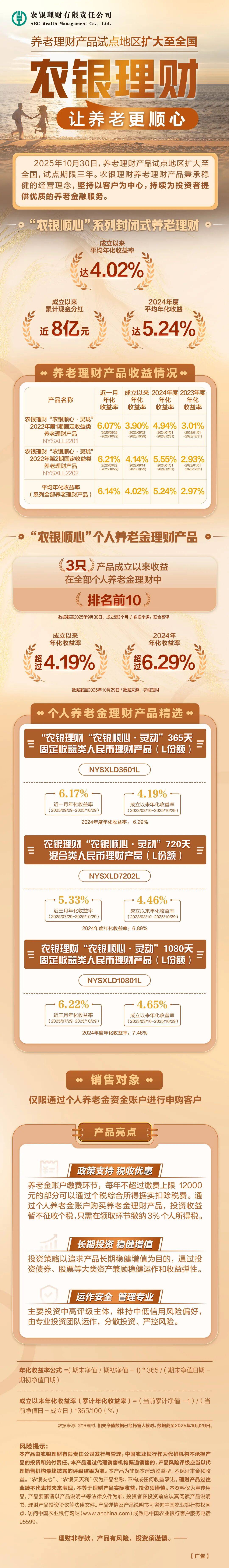 2025年10月30日,养老理财试点地区扩大至全国,试点期限三年。作为国有大行理财子公司,农银理财近年来在养老金融领域持续发力,通过完善产品体 系、优化投资策略、加强投资者服务,探索出一条服务居民养老需求、支持银发经济高质量发展的有效路径。 分红落袋彰显诚意,投资运作成效显著 今年以来,农银理财两只"农银顺心"系列封闭式老理财产品迎来新一轮分红,两只产品合计现金分红金额近4亿元,成立以来累计现金分红近8亿元,实实 在在将"养老钱"的增值收益落到投资者口袋,是农银理财践行"以客户为中心"养老金融服务承诺的直接体现。另外,两只产品2024年度年平均年化收益达 5.24%,更彰显了其在养老理财产品运作上的稳健实力。 在"稳健为先"的投资理念指导下,农银理财产品的长期收益表现展现出行业领先水平。今年以来,因为债市调整,仅依靠票息难以满足投资者对"稳中求 进"的双重诉求。在此情况下,农银理财养老理财产品充分发挥了大类资产配置的优势,"固收+"策略中"+"的部分对实现目标收益起了更为重要的作用。 农银理财扎实打造投研体系,提升投研能力,布局了指数策略、红利策略、量化策略以及商品策略等多种投资策略,丰富了权益投资的工具箱, ...