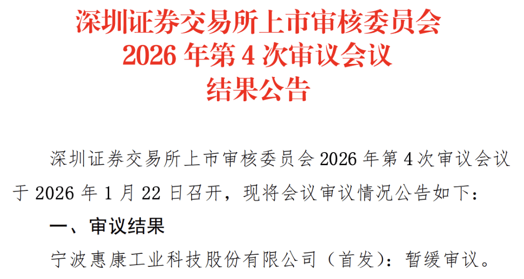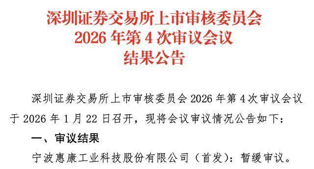 深交所网站显示, 1 月 22 日,深交所上市审核委员会召开 2026 年第 4 次审议会,对于惠康科技的首发申请,给出了 " 暂缓审议 " 的 结果。 【导读】惠康科技 IPO 遭暂缓审议 中国基金报记者 夏天 | 公司全称 | 宁波惠康工业科技股份有限公司 | 公司简称 | 恵康科技 | | --- | --- | --- | --- | | 受理日期 | 2025-06-12 | 更新日期 | 2026-01-22 | | 审核状态 | 暂缓审议 | 预计融资金额(亿元) | 17.9655 | | 保荐机构 | 财通证券股份有限公司 | 保存代表人 | 周斌烽,熊昊倩 | | 会计师事务所 | 中汇会计师事务所(特殊普通合伙) | 签字会计师 | 黄婵娟,于佳,王瑞 | | 律师事务所 | 北京国枫律师事务所 | 签字律师 | 杨婕,成威,陈楹 | | 评估机构 | 天源资产评估有限公司 | 签字评估师 | 陈菲连,罗小建 | 这是 2026 年以来,深交所首单遭 暂 缓审议的 IPO 项 目。 招股说明书显示, 惠 康 科 技成立于 2001 年,深耕制冷领域,是一家以制冷设备的研发、生产及销售为核 ...