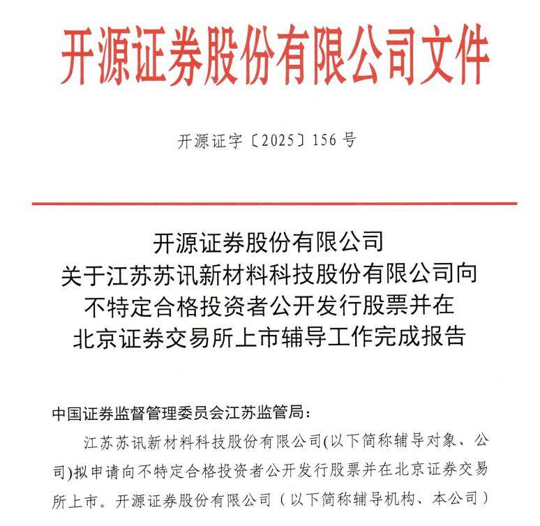 瑞财经 刘治颖 近日,江苏苏讯新材料科技股份有限公司(以下简称:苏讯新材)披露上市辅导工作完成报告,开源证券为辅导机构。 2025年2月25日,开源证券与苏讯新材签署了辅导协议,并按照相关规定及双方约定开展辅导工作。2025年3月4日,中国证券监督管理委员会江苏监管局对苏 讯新材进行了辅导备案登记。自2025年3月4日至本报告签署日,开源证券共开展了三期辅导工作。 苏讯新材成立于2009年4月,是一家致力于各类型钢薄板和特种钢丝研发、生产与销售的高新技术企业和工信部专精特新"小巨人"企业,主要产品包括镀铬 薄板、镀锡薄板、不锈钢薄板、食品级热覆膜铁、光纤光缆用钢塑复合带、冷轧薄板、特种钢丝等。 根据中国包装联合会出具的证明,苏讯新材是国内首家规模化提供食品级不锈钢包装材料的厂家,2020年至2024年公司镀铬薄钢带产品的国内市场占有率连 续五年排名第一,2022年至2024年公司啤酒罐用覆膜薄钢带产品的市场占有率连续三年排名第一。 2025年上半年,苏讯新材实现营业收入15.54亿元,同比涨幅8.24%。归属于母公司所有者的净利润为1.41亿元,同比增长35.63%。截止2025年6月末,公司 总资产19.8 ...