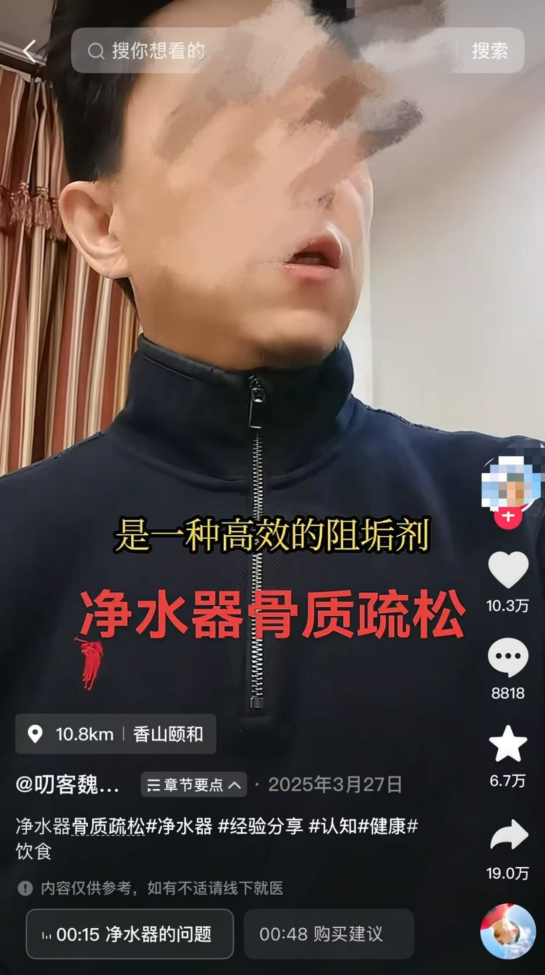 央广网北京1月12日消息(总台记者管昕 张冰川)据中央广播电视总台中国之声《新闻纵横》报道,近期,多个社交平台上流传着这样一种说法:"有 些净水器为了防止结垢,会在过滤水中加入含磷酸盐的阻垢剂,而长期喝这样的含磷水可能会引起骨质疏松。"记者注意到,多篇相关贴文和短视频在社交 平台上引发大量转发和留言,部分网友因此对家中的净水器存有疑虑。阻垢剂是什么?这种说法科学吗? "如果你长期喝了带有磷酸盐的水,会导致体内的钙磷比例失调,引发骨质疏松,血管钙化、血压升高等等。" 博主在某短视频平台声称阻垢剂会导致骨质疏松 记者在某短视频平台看到,该视频仅在平台内的转发量就达19万次,收藏量6.7万,留言8818条。大量网友留言,把身体出现的不适与家中的净水器相 关联。类似视频存在于多个社交平台。 "净水器最大的秘密就在这里,不想40岁坐上轮椅就瞪大眼睛看!这根RO反渗透膜滤芯里的白色珠子就是阻垢剂……" 某平台博主自称净水器专业人士声称阻垢剂导致骨质疏松 最近,安徽合肥市民张女士正打算购买净水器,在网上就刷到了这样的贴子。 张女士说:"可能是搜索过这类的信息吧,App就给我推送了更多的帖子,我又看到有博主说,光是出水不含阻 ...