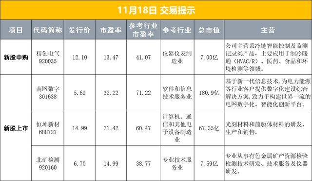 | | | | | 11月18日 交易提示 | | | | | --- | --- | --- | --- | --- | --- | --- | --- | | 项目 | 代码简称 发行价 | | 市盈率 | 参考行业 市盈率 | 参考行业 | 总市值 | 主营 | | 新股申购 | 精创电气 920035 | 12. 10 | 13. 47 | 41. 07 | 仪器仪表制 造业 | 7.00亿 | 公司主营系冷链智能控制及监测 IC求类产品,主要应用于制冷暖 通(HVAC/R)、医药、食品和环 | | | 南网数字 301638 | 5. 69 | 32. 22 | 71.22 | 软件和信息 技术服务业 | 180. 9亿 | 境检测等领域。 基于新一代信息技术,为电力能源 等行业客户提供数字化建设综合 解决方案,致力于构建世界一流的 电网数字化、智能化创新平台。 | | | 恒坤新材 | | | | 计算机、通 信和其他电 | | 光刻材料和前驱体材料的研发、 | | 新股上市 | 688727 | 14. 99 | 71. 42 | 60. 47 | 手设备制造 | 67. 35亿 | 生产和销售 ...
