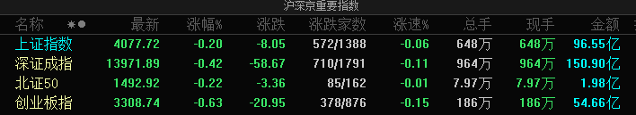 凤凰网财经讯 1月8日,三大指数集体低开,沪指低开0.20%,深成指低开0.42%,创业板指低开0.63%, 有色·锌、航天系、有色·钴等板块指数跌幅居前。 | | | | | 户深京重要指数 | | | | | --- | --- | --- | --- | --- | --- | --- | --- | | 名称 *● | 最新 | 张幅% | | 涨跌 涨跌家数 | | 总手 | 现手 金额 | | 上证指数 | 4077.72 | -0.20 | -8.05 | 572/1388 | -0.06 | 648 元 | 648万 96.55亿 | | 深证成指 | 13971.89 | -0.42 | -58.67 | 710/1791 | -0.11 | 9647 | 964万 150.90亿 | | 北证50 | 1492.92 | -0.22 | -3.36 | 85/162 | -0.01 | | 7.97万 7.97万 1.98亿 | | 创业板指 | 3308.74 | -0.63 | -20.95 | 378/876 | -0.15 | and the | 186万 54.66亿 | 外盘市 ...