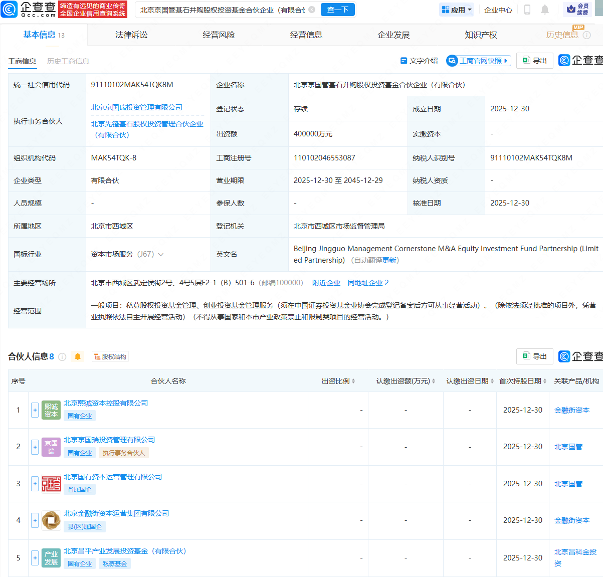 Group 1 - Beijing Jingguo Management Cornerstone M&A Equity Investment Fund Partnership (Limited Partnership) has been established with a capital contribution of 4 billion yuan [1][2] - The fund's business scope includes private equity investment fund management and venture capital fund management services [1][2] - The partnership is co-funded by Beijing State-owned Capital Operation Management Co., Ltd. and Beijing Financial Street Capital Operation Group Co., Ltd. [1][3] Group 2 - The fund is registered in Xicheng District, Beijing, with a business duration from December 30, 2025, to December 29, 2045 [2] - The executing partner of the fund is Beijing Jingguo Rui Investment Management Co., Ltd. [2][3] - The fund must complete registration with the Asset Management Association of China before commencing its business activities [2]