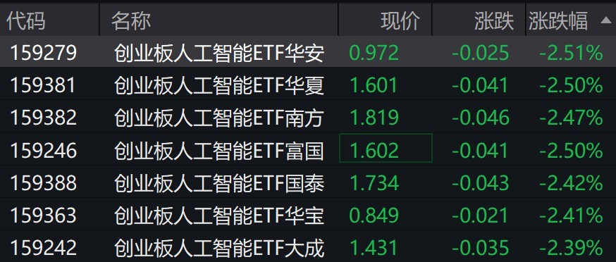 受盘面影响,创业板人工智能ETF跌超2%。 | 代码 | 名称 | 现价 | | 涨跌 涨跌幅 ◀ | | --- | --- | --- | --- | --- | | 159279 | 创业板人工智能ETF华安 | 0.972 | -0.025 | -2.51% | | 159381 | 创业板人工智能ETF华夏 | 1.601 | -0.041 | -2.50% | | 159382 | 创业板人工智能ETF南方 | 1.819 | -0.046 | -2.47% | | 159246 | 创业板人工智能ETF富国 | 1.602 | -0.041 | -2.50% | | 159388 | 创业板人工智能ETF国泰 | 1.734 | -0.043 | -2.42% | | 159363 | 创业板人工智能ETF华宇 | 0.849 | -0.021 | -2.41% | | 159242 | 创业板人工智能ETF大成 | 1.431 | -0.035 | -2.39% | 创业板人工智能概念股早盘走低,协创数据跌超7%,新易盛跌超6%,中际旭创跌超4%。 (文章来源:每日经济新闻) 有券商表示,AI ...