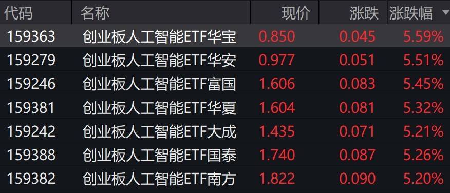 创业板人工智能概念股走强,新易盛涨超12%,中际旭创涨超9%,天孚通信涨超5%。 | 代码 | 名称 | 现价 | 涨跌 | 涨跌幅 | | --- | --- | --- | --- | --- | | 159363 | 创业板人工智能ETF华宝 | 0.850 | 0.045 | 5.59% | | 159279 | 创业板人工智能ETF华安 | 0.977 | 0.051 | 5.51% | | 159246 | 创业板人工智能ETF富国 | 1.606 | 0.083 | 5.45% | | 159381 | 创业板人工智能ETF华夏 | 1.604 | 0.081 | 5.32% | | 159242 | 创业板人工智能ETF大成 | 1.435 | 0.071 | 5.21% | | 159388 | 创业板人工智能ETF国泰 | 1.740 | 0.087 | 5.26% | | 159382 | 创业板人工智能ETF南方 | 1.822 | 0.090 | 5.20% | 受盘面影响,创业板人工智能相关ETF涨约5%。 有券商表示,AI应用生态日趋完善,大模型技术在金融、医疗、教育等垂直领域的 ...