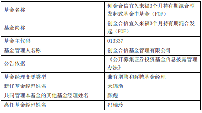 中国经济网北京9月2日讯今日,创金合信基金公告,创金合信汇选6个月持有期混合发起(FOF)、创金合 信宜久来福3个月持有期混合发起(FOF)增聘宋锦浩,冯瑞玲离任。 创金合信宜久来福3个月持有期混合发起(FOF)A/C成立于2021年12月8日,截至2025年8月28日,其今年 来收益率为0.93%、0.68%,成立来收益率为4.15%、2.62%,累计净值为1.0415元、1.0262元。 | 基金名称 | 创金合信宜久来福3个月持有期混合型 | | --- | --- | | | 发起式基金中基金(FOF) | | 基金简称 | 创金合信宜久来福3个月持有期混合发 起(FOF) | | 基金主代码 | 013337 | | 基金管理人名称 | 创金合信基金管理有限公司 | | 公告依据 | 《公开募集证券投资基金信息披露管理 | | | 办法》 | | 基金经理变更类型 | 兼有增聘和解聘基金经理 | | 新任基金经理姓名 | 宋锦浩 | | 共同管理本基金的其他基金经理姓名 | 颜彪 | | 离任基金经理姓名 | 冯瑞玲 | | 基金名称 | 创金合信汇选6个月持有期混合型发起 | | --- | -- ...