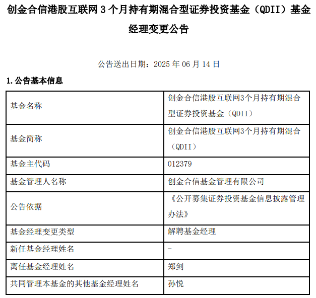 郑剑离任创金合信港股互联网3个月持有期混合