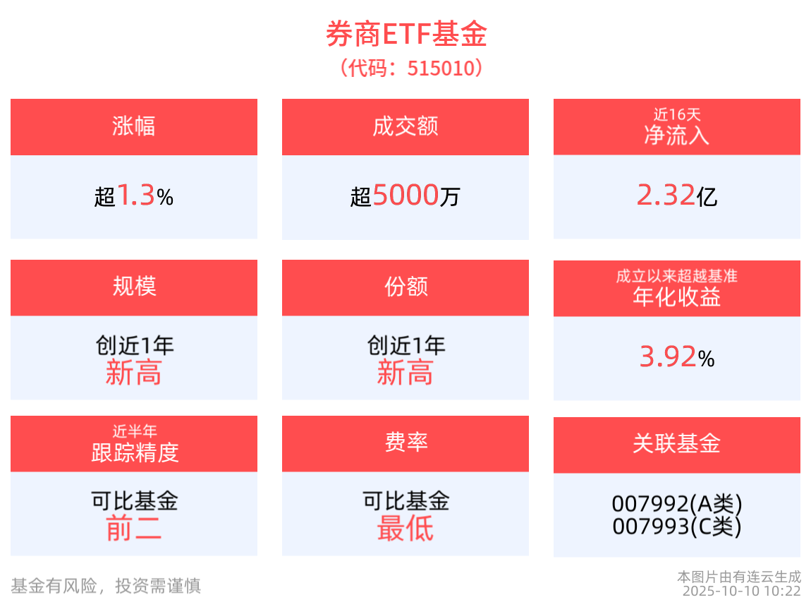 逆市上涨1.3%,券商ETF基金(515010)近16个交易日净流入2.32亿元