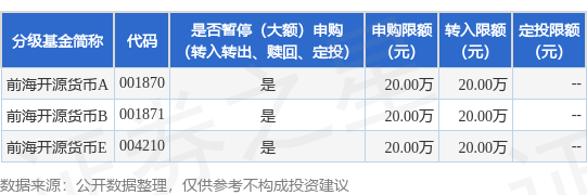 | 分级基金简称 | 代码 | 是否暂停(大额)申购 | | 申购限额 转入限额 定投限额 | | | --- | --- | --- | --- | --- | --- | | | | (转入转出、赎回、定投) | (元) | (元) | (元) | | 前海开源货币A 001870 | | 를 | 20.00万 | 20.00万 | | | 前海开源货币B 001871 | | 를 | 20.00万 | 20.00万 | | | 前海开源货币E 004210 | | 를 | 20.00万 | 20.00万 | | 证券之星消息,8月13日前海开源基金管理有限公司发布《关于前海开源现金增利货币市场基金调整非 个人投资者大额申购、定期定额投资及转换转入业务限制的公告》。公告中提示,为了保证基金的平稳 运作,维护基金份额持有人利益,自2025年8月13日起前海开源现金增利货币市场基金调整非个人投资 者大额申购、定期定额投资及转换转入业务限制,下属分级基金调整明细如下: 注:本基金B类基金份额暂未开通定期定额投资业务。 以上内容为证券之星据公开信息整理,由AI算法生成(网信算备310104345710301240 ...