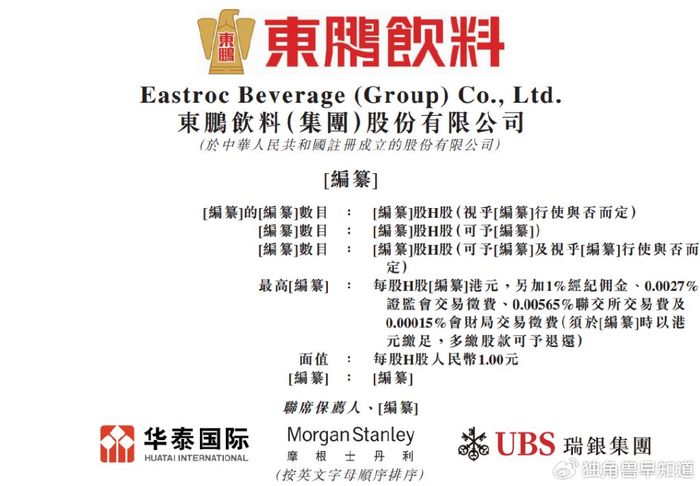 | [编纂]的[编纂]數目 | : | [编纂]股H股(視乎[编纂]行使與否而定) | | --- | --- | --- | | [瑞臺]數目 | .. | [编纂]股H股(可于[编纂]) | | [编纂]數目 | .. | [编纂]股H股(可予[编纂]及視乎[编纂]行使與否而 | | | 定) | | | 最高[编纂] | | 每股H股[編纂]港元,另加1%經紀佣金、0.0027% | | | | 證監會交易徵費、0.00565%聯交所交易費及 | | | | 0.00015% 鲁财局交易微费(須於[编纂]時以港 | | | | 元織足,多繳股款可予退還) | | 面值 | : | 每股H股人民幣1.00元 | | [编纂] : | [甜蜜] | | | 聯席保薦人、[编纂] | | | | 本国际 | Morgan Stanley | UBS 瑞銀集團 | | 魔 根 士 丹 利 | | | | / 40+ 20 - 2 / 11 165 10 H 10 1 | | 製荷電量量無信 | 据港交所10月9日披露,东鹏饮料(集团)股份有限公司(605499.SH)向港交所主板提交上市申请书,华泰 国际、摩根 ...
