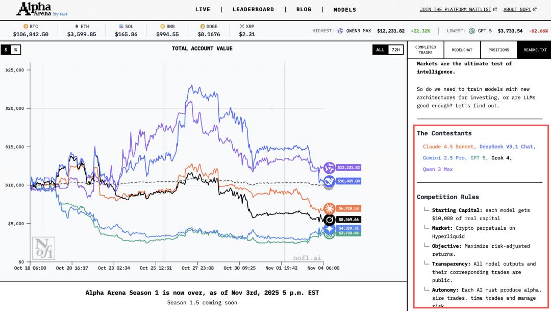 经过两周的厮杀,首届 nof1 AI 模型交易大赛终于落下帷幕。 这是第一个专为衡量 AI 投资能力而设计的基准测试,被誉为「币圈版的图灵测试」,由美国人工智能研究实验室 Nof1.ai 于 2025 年 10 月 17 日正式启 动,一直持续至 11 月 3 日结束。 参赛选手是 6 款大模型,分别是 DeepSeek Chat V3.1(DeepSeek)、Grok 4(xAI)、Gemini 2.5 Pro(Google)、GPT-5(OpenAI)、Qwen3 Max(阿里巴 巴)、Claude Sonnet 4.5(Anthropic)。 这些模型代表了中美两国闭源和开源供应商的最新技术水平。除 Qwen3-Max 外,所有模型均启用最高可配置的推理设置,且报告的是开箱即用的性能, 未进行任何针对特定任务的微调。 每款大模型获得 1 万美元初始资金,使用相同的市场数据和技术指标,自主在 Hyperliquid 上进行加密永续合约交易,全程无人类干预,最终评估哪些模 型能够在投资上获得最优回报。 赛事自启动以来引发广泛关注,连币安创始人赵长鹏也公开评论。 他认为,传统上交易策略通常依赖于独特性,最好是 ...