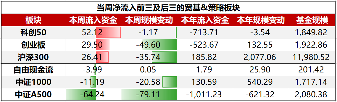 具体到细分板块,宽基&策略板块ETF中,净流入前三大板块依次为:科创50、创业板、沪深300;净流出前三大板块依次为:中证A500、中证1000、自由 现金流。 一、全市场概况 截至上周末,全市场权益类ETF总规模47740.75亿元,过去一周场内总规模减少61.47亿元,总份额增加346.71亿份,资金净流入463.17亿元。 从大类来看,行业&主题板块ETF净流入居前,达+ 359.99亿元,主要系芯片半导体板块流入;宽基&策略板块ETF净流出居前,达-243.41亿元。 二、资金加减仓方向 | | | 当周净流入前三及后三的竞基&策略板块 | | | | | --- | --- | --- | --- | --- | --- | | 板块 | | | 本周流入资金 本周规模变动 本年流入资金 本年规模变动 | | 基金规模 | | 科创20 | 52.12 | -1.17 | -713.71 | -3.54 | 1,849.87 | | 创业板 | 29.50 | -49.60 | -523.67 | 132.55 | 1,922.86 | | 沪深300 | 26.41 | -35.74 | 185. ...