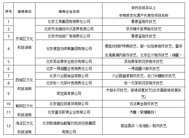 新京报讯 据北京市文化和旅游局消息,日前,北京市文化和旅游局发布通知,认定北京工美集团有限责 任公司、北京市丰台区巧娘手工艺发展中心、北京石光长城民宿有限公司等首批25家北京市非遗工坊。 被评为首批北京市非遗工坊的单位要积极探索"非遗+"创新发展路径,各区文旅部门要加强对辖区内非遗 工坊的指导服务,共同推动其在非遗人才培育、技艺传承、促进就业等方面发挥示范作用。 | 序号 | 推荐单位 | 推荐企业名称 | 依托区级及以上 | | --- | --- | --- | --- | | | | | 非物质文化遗产代表性项目名称 | | 13 | 石景山区文 | 隆和恒泰(北京)文化旅游产业有限公司 | 和香制作技艺 | | | 化和旅游局 | | | | 14 | 门头沟区文 | 北京明珠琉璃制品有限公司 | 琉璃烧制技艺 | | | 化和旅游局 | | | | 1 ਦੇ | 房山区文化 | 北京仁和酒业有限责任公司 | "菊花白"酒传统酿制技艺 | | | 和旅游局 | | | | 16 | 顺义区文化 | 北京吉祥八宝葫芦手工艺品产销 | 火绘葫芦技艺 | | | 和旅游局 | 专业合作社 | | | 17 ...