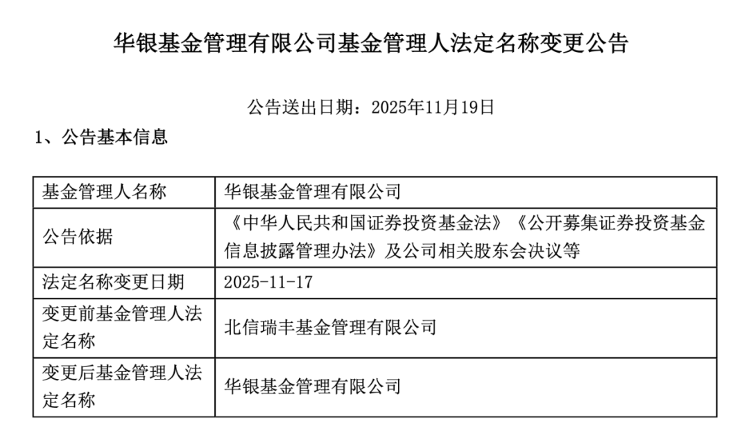 【导读】北信瑞丰基金正式更名为华银基金 中国基金报记者 李树超 王思文 11月19日,原北信瑞丰基金发布更名公告显示,自11月17日起,该公司名称由此前的"北信 瑞丰基金管理有限公司"变更为"华银基金管理有限公司"。 公告显示,公司名称变更,已完成工商变更登记手续,后续将对旗下公募基金产品名称进行 相应变更。 | 基金管理人名称 | 华银基金管理有限公司 | | --- | --- | | 公告依据 | 《中华人民共和国证券投资基金法》 《公开募集证券投资基金 | | | 信息披露管理办法》及公司相关股东会决议等 | | 法定名称变更日期 | 2025-11-17 | | 变更前基金管理人法 | 北信瑞丰基金管理有限公司 | | 定名称 | | | 变更后基金管理人法 | 华银基金管理有限公司 | | 定名称 | | 根据公告,华银基金表示, 将按照相关法律法规的规定,向中国证监会申请更换经营证券期 货业务许可证。 北信瑞丰基金正式更名华银基金 据悉,华银基金(原北信瑞丰基金)成立于2014年3月17日,是经中国证监会批准设立,由 北京国际信托有限公司与莱州瑞海投资有限公司共同发起设立的基金管理公司,两者分别 ...