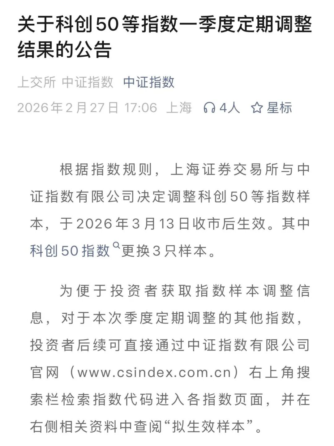 2月27日晚,上交所和中证指数有限公司联合发布公告称,根据指数规则,上交所与中证指数有限公司决定调整科创50等指数样本,于3月13日收市后生 效。 图片来源:"中证指数"微信公众号 其中,科创50指数更换3只样本,国盾量子、中科飞测、中科星图将被调入科创50指数。热景生物、斯瑞新材、君实生物等将被调入科创100指数。 | 调出名单 | | 调入名单 | | | --- | --- | --- | --- | | 证券代码 | 证券名称 | 证券代码 | 证券名称 | | 688180 | 君实生物 | 688027 | 国唐量子 | | 688475 | 萤石网络 | 688361 | 中科飞测 | | 688819 | 天能股份 | 688568 | 中科星图 | | 排序 | 证券代码 | 证券名称 | | --- | --- | --- | | | 688002 | 客创微纳 | | 2 | 688629 | 华丰科技 | | 3 | 688318 | 财富趋势 | | 4 | 688347 | 华虹公司 | | 5 | 688172 | 燕东微 | 另一方面,科创50指数和科创100指数实现了体系内样 ...