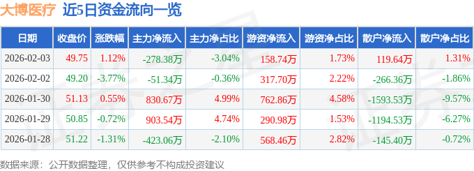 该股主要指标及行业内排名如下: 证券之星消息,截至2026年2月3日收盘,大博医疗(002901)报收于49.75元,上涨1.12%,换手率 0.64%,成交量1.85万手,成交额9164.35万元。 2月3日的资金流向数据方面,主力资金净流出278.38万元,占总成交额3.04%,游资资金净流入158.74 万元,占总成交额1.73%,散户资金净流入119.64万元,占总成交额1.31%。 近5日资金流向一览见下表: | | | | | 日期 收盘价 涨跌幅 主力净流入 主力净占比 游资净点比 散户净流入 散户净占比 | | | | | | --- | --- | --- | --- | --- | --- | --- | --- | --- | | 2026-02-03 | 49.75 | 1.12% | -278.38万 | -3.04% | 158.74万 | 1.73% | 119.64万 | 1.31% | | 2026-02-02 | 49.20 | -3.77% | + -51.34万 | -0.36% | 317.70万 | 2.22% | -266.36万 | -1.86% | | 202 ...