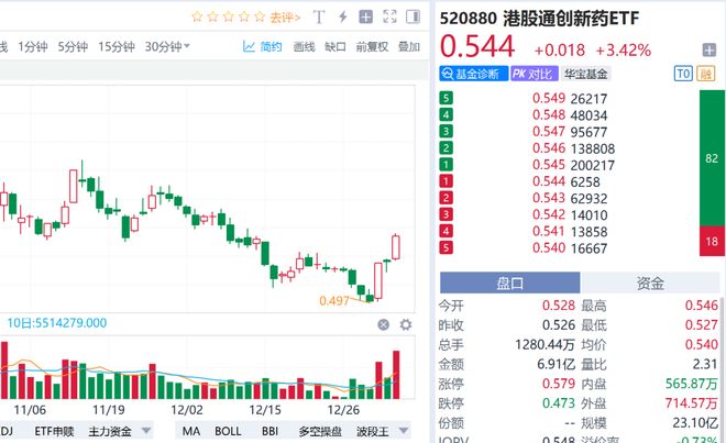 2026年开门红,中国资产迎来"红包"行情!今日(1月5日),A股高开高走,创业板指领涨2.85%,沪指重回4000点上方斩获12连阳,创1993年以来最长连 阳纪录,放量成交超2.5万亿元。元旦假期港股率先迎来开门红,1月2日恒生指数收涨2.76%,恒生科技指数涨4%,今日港股继续震荡上扬。 盘面上,港股通创新药领衔港股大反攻,创新药含量100%的港股通创新药ETF(520880)场内绝地反击,暴涨5.42%放量成交超5亿元;港股AI核心工具 ——港股互联网ETF(513770)场内跳空大涨4.43%,一举收复4根重要均线;全市场首只聚焦"港股芯片"的港股信息技术ETF(159131)场内反弹3.63%。 | 序号 代码 | | 一 教堂 名称 | 现价 | 涨跌幅 ▼ | 成交额 | | --- | --- | --- | --- | --- | --- | | 11 | 520880 | 跨 港股通创新药ETF T+0 | 0.525 c | 5.42% | 5.09亿 | | 2 | 513770 | 跨 港股互联网ETF T+0 | 0.542 c | 4.43% | 8.16亿 | | 3 159 ...