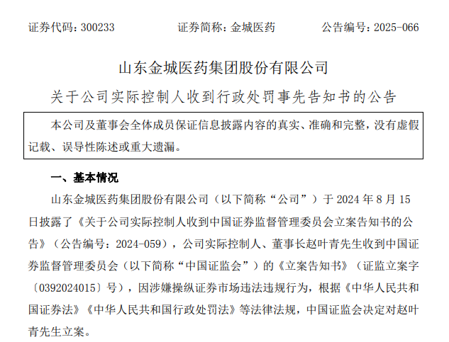 金城医药(300233.SZ)10月9日公告称,9月30日,公司收到实际控制人、董事长赵叶青的通知,因涉嫌操纵证券市场违法违规行为,其收到证监会重新下 发的《行政处罚事先告知书》(处罚字﹝2025﹞69号)。 内容显示,赵叶青、王震、刘峰涉嫌违反2005年《证券法》第七十七条第一款第一项、第三项的规定,构成2005年《证券法》第二百零三条所述操纵证券市 场的违法行为。对此,《告知书》拟决定如下: 一、依据2005年《证券法》第二百零三条的规定,对赵叶青、王震、刘峰处以300万元罚款,其中赵叶青承担150万元,王震承担120万元,刘峰承担30万 元。 二、依据2005年《证券法》第二百三十三条和《证券市场禁入规定》(证监会令第115号)第三条第一项、第七项和第五条的规定,对赵叶青采取4年市场禁 入措施;对王震采取3年市场禁入措施。自我会宣布决定之日起,在禁入期间内,除不得继续在原机构从事证券业务或者担任原上市公司、非上市公众公司 董事、监事、高级管理人员职务外,也不得在其他任何机构中从事证券业务或者担任其他上市公司、非上市公众公司董事、监事、高级管理人员职务。 金城医药表示,该《行政处罚事先告知书》所涉主体为赵 ...