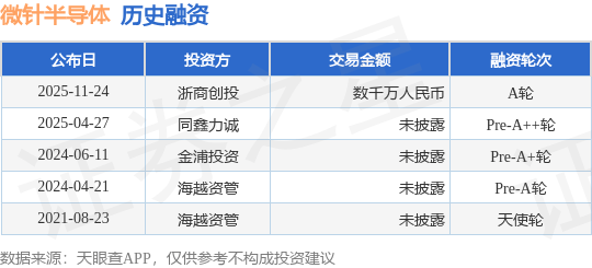 证券之星消息,根据天眼查APP于11月24日公布的信息整理,浙江微针半导体有限公司A轮融资,融资 额数千万人民币,参与投资的机构包括浙商创投。 数据来源:天眼查APP | 公布日 | 投资方 | 交易金额 | 融资轮次 | | --- | --- | --- | --- | | 2025-11-24 | 浙商创投 | 数千万人民币 | A轮 | | 2025-04-27 | 同鑫力诚 | 未披露 | Pre-A++轮 | | 2024-06-11 | 金浦投资 | 未披露 | Pre-A+轮 | | 2024-04-21 | 知识错换 | 未披露 | Pre-A轮 | | 2021-08-23 | 知识错要 | 未披露 | 天使轮 | 以上内容为证券之星据公开信息整理,由AI算法生成(网信算备310104345710301240019号),不构成 投资建议。 浙江微针半导体有限公司成立于2021-05-27,主要经营半导体器件专用设备制造;半导体器件专用设备 销售;集成电路制造;集成电路销售。 ...