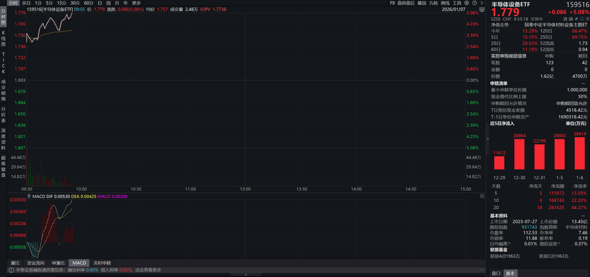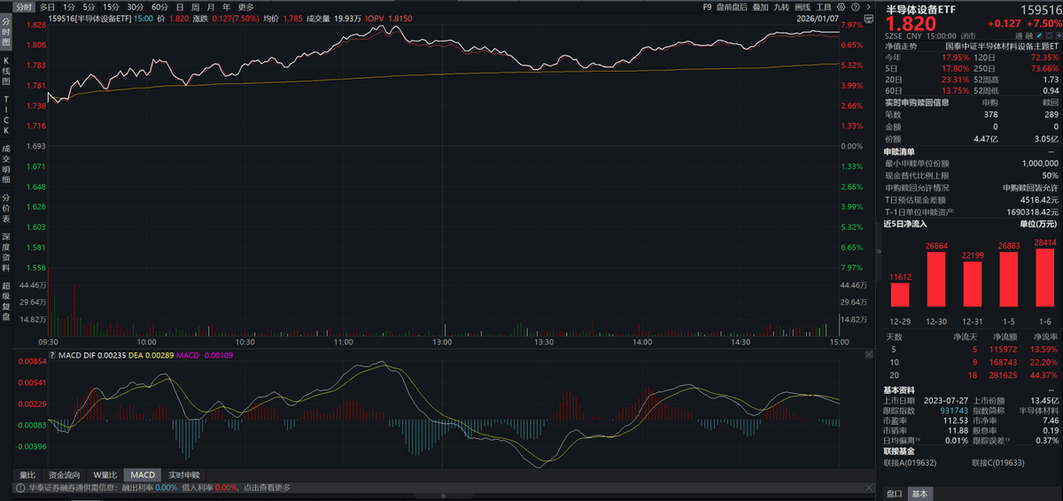 来源:WIND 半导体设备ETF(159516)又双叒强势,三连阳再创新高。消息面上,商务部发布2026年第1号关于加 强两用物项对日本出口管制的公告;近期中日摩擦加大,国产替代逻辑加强; CES大会上,英伟达宣 布在网络体系增加一个独立的高速"记忆层",存储需求大幅增长;1月6日夜盘美股存储强势。1月7日半 导体设备继续强势,收盘大涨7.50%。 | 半导体设备ETF(159516.SZ) | | | | | | | --- | --- | --- | --- | --- | --- | | 闭市 01-07 15:00:00 | | | | | | | 1.820 | | 昨收 | 1.693 | 流通盘 | 61.88亿 | | +0.127 +7.50% | | 开盘 | 1.742 | 流通值 | 113亿 | | 最高 | 1.828 | 成交量 | 1332.5万 | 换手率 | 21.54% | | 最低 | 1.741 | 成交额 | 23.79亿 | 均价 | 1.785 | | IOPV | 1.8150 | 溢折率 | 0.28% | 贴水率 | 7.67% | | 净值走势 国泰中证 ...