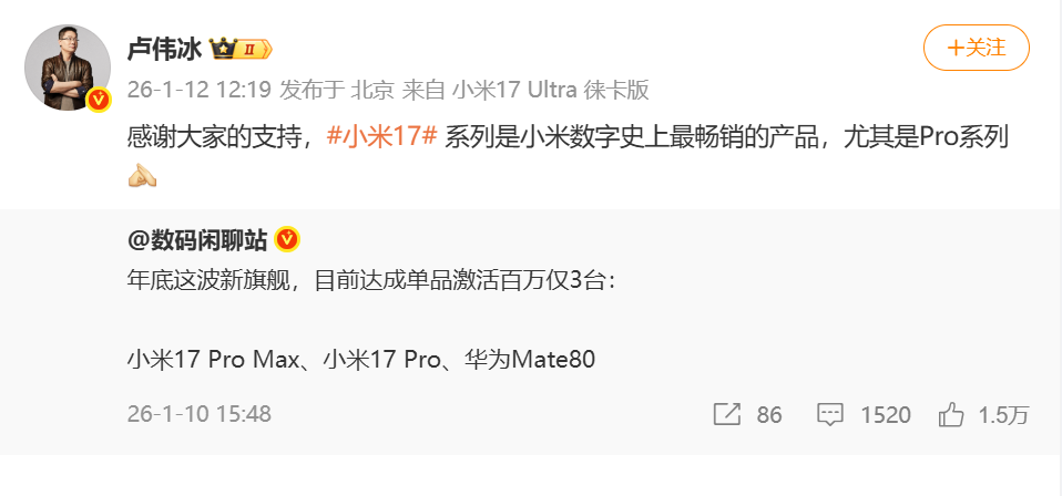 卢伟冰:17 系列是小米数字史上最畅销的产品