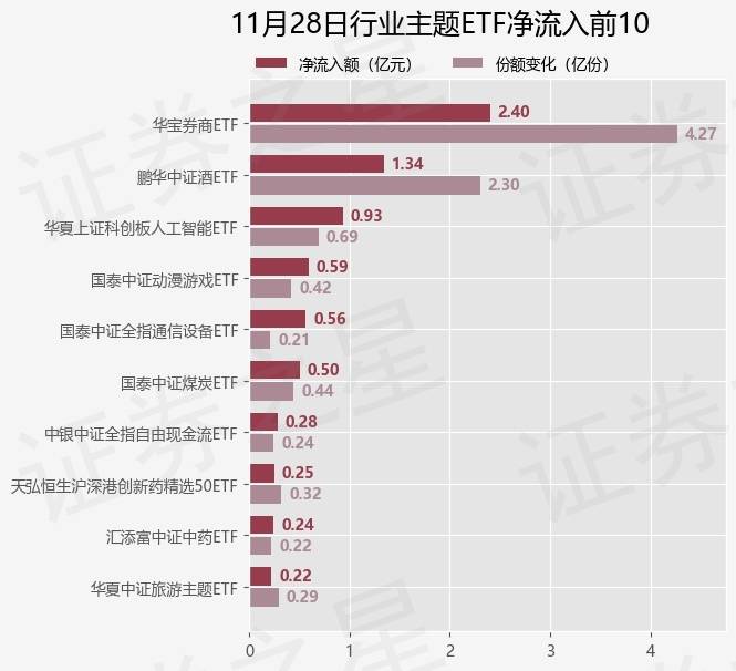 11月28日行业主题ETF 净流出前10明细表 | 代码 | 基金简称 | 涨跌幅 | 份额变化 | 最新份额 | 净流入额 | | 最新规模 | | --- | --- | --- | --- | --- | --- | --- | --- | | | | | (亿元) | (1243) | (亿元) | | (亿元) | | 512000 | 华宝券商ETF | 0.36% | 4.27 | 698.47 | | 2.40 | 394.07 | | 512690 | 鹏华中证酒ETF | 0.00% | 2.30 | 377.44 | | 1.34 | 220.04 | | 589010 | 华夏上证科创板人工智能ETF | 0.90% | 0.69 | 21.06 | | 0.93 | 28.38 | | 516010 | > 国泰中证动漫游戏ETF | -0.21% | 0.42 | 24.27 | | 0.59 | 33.89 | | 515880 | 国泰中证全指通信设备ETF | 0.34% | 0.21 | 42.30 | | 0.56 | 113.00 | | 515220 | 国泰中证煤炭 ...