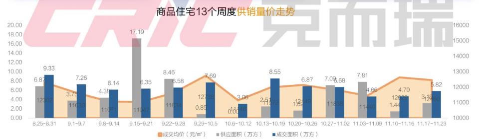 上周(2025年11月17日-23日),昆明楼市成交量涨价跌,价格受空港板块项目集中备案带动,回调至12400元/㎡。官渡区圈定年内工作重点,全年完成 拆迁27万㎡,加快巫家坝开发;呈贡龙街村新地块启动征收,为中学腾地;昆明将举行住宅专项维修资金管理办法听证会,官渡区重启购房契税补贴申 报。 据克而瑞发布的最新数据显示,上周昆明共计3个项目向市场供应了约3.19万㎡,环比上涨122%;成交约5.82万㎡,环比上涨24%;成交均价约12460元/ ㎡,环比微跌1%。 (图源:克而 瑞) 从"双榜"情况看,近期加推的南市区四代宅邦泰观云,连续两周位居商品住宅销售金额TOP5榜首,销售约0.72亿元,成交23套,成交均价约19041元/㎡, 套均价约314万/套。 山海湾·金澜锦翠则以约0.28亿元、成交19套的成绩,位居双榜第三,成交均价约13314元/㎡,套均价约149万/套。 (山海湾·金澜锦翠建设进展实拍图) 华润中心旧规产品调价后持续劲销,单周销售约0.29亿元,成交均价约14794元/㎡,套均价约267万/套。 龙湖旗下的龙湖·山海原著、龙湖峯萃两个高端改善项目也榜上有名,分别销售0.22亿元、0.19 ...