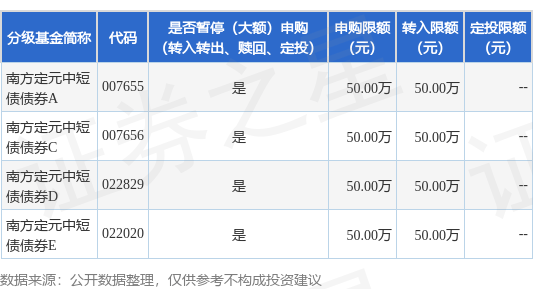 以上内容为证券之星据公开信息整理,由AI算法生成(网信算备310104345710301240019号),不构成 投资建议。 证券之星消息,9月22日南方基金管理股份有限公司发布《南方定元中短债债券型证券投资基金2025年 国庆节、中秋节前限制大额申购、定投和转换转入业务的公告》。公告中提示,为保护基金份额持有人 的利益,自2025年9月29日起南方定元中短债债券型证券投资基金2025年国庆节、中秋节前限制大额申 购、定投和转换转入业务,申购、转换转入上限金额为50.0万元,下属分级基金调整明细如下: | 分级基金简称 | 代码 | 是否暂停(大额)申购 (转入转出、赎回、定投) | | 申购限额 转入限额 定投限额 | (元) | | --- | --- | --- | --- | --- | --- | | | | | (元) | (元) | | | 南方定元中短 债债券A | 007655 | 를 | 50.00万 | 50.00万 | | | 南方定元中短 债债券C | 007656 | 를 | 50.00万 | 50.00万 | | | 南方定元中短 债债券D | 022829 | 를 | 50.0 ...
