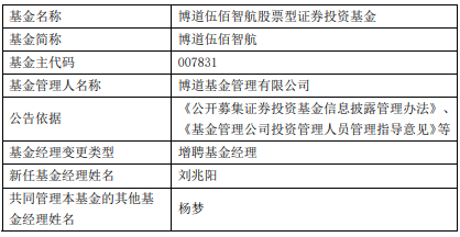 中国经济网北京10月20日讯近日,博道基金公告,杨梦离任博道叁佰智航,刘兆阳管理。 刘兆阳2022年7月加入博道基金管理有限公司,先后担任量化投资部量化研究员、高级量化研究员。 2025年7月23日起任博道伍佰智航股票型证券投资基金、博道叁佰智航股票型证券投资基金的基金经 理。 博道叁佰智航A/C成立于2019年6月5日,截至2025年10月17日,其今年来收益率为18.51%、18.13%,成 立来收益率为83.99%、79.37%,累计净值为1.7917元、1.7480元。 | 基金名称 | 博道叁佰智航股票型证券投资基金 | | --- | --- | | 基金简称 | 博道叁佰智航 | | 基金主代码 | 007470 | | 基金管理人名称 | 博道基金管理有限公司 | | 公告依据 | 《公开募集证券投资基金信息披露管理办法》 | | | 《基金管理公司投资管理人员管理指导意见》等 | | 基金经理变更类型 | 解聘基金经理 | | 共同管理本基金的其他基 | 刘兆阳 | | 金经理姓名 | | | 离任基金经理姓名 | 杨梦 | ...