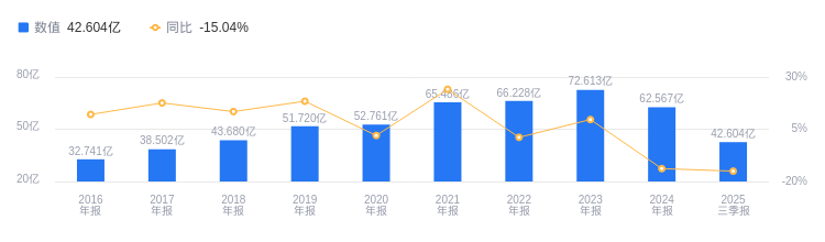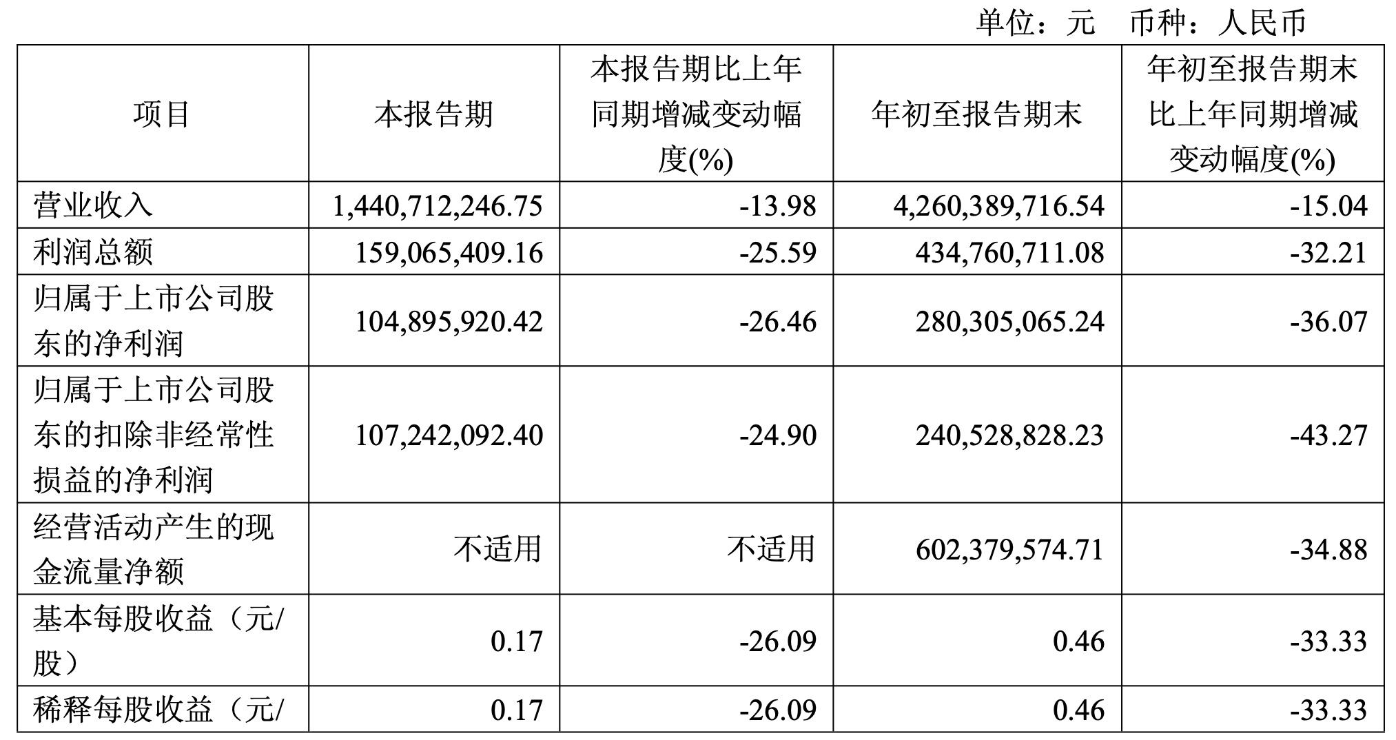 处在多事之秋的绝味食品,披露了"戴帽"后的首份季报。 10月28日,ST绝味发布2025年第三季度报告,前三季度,公司实现营业收入42.60亿元,同比减少15.04%;归母净利润2.80亿元,同比减少36.07%;扣非净 利润2.41亿元,同比减少43.27%。 其中,第三季度,公司实现营业收入14.41亿元,同比减少13.98%;归母净利润1.05亿元,同比减少26.46%;扣非净利润1.07亿元,同比减少24.90%。 | 项目 | 本报告期 | 本报告期比_ 同期增减变运 | | | --- | --- | --- | --- | | | | 度(%) | | | 营业收入 | 1,440,712,246.75 | | | | 利润总额 | 159,065,409.16 | r I | | | 归属于上市公司股 | 104,895,920.42 | | | | 东的净利润 | | | | | 归属于上市公司股 东的扣除非经常性 | 107,242,092.40 | | | | 损益的净利润 | | | | | 经营活动产生的现 | 不适用 | | へ | | 金流量净额 | | | | | 基本每股收益 ...