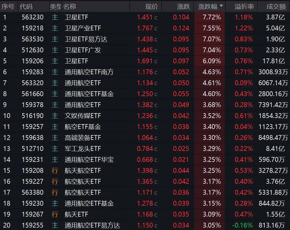 Core Viewpoint - The aerospace sector is experiencing significant growth, with satellite-themed ETFs leading the market, showing a strong performance with multiple ETFs rising over 7% in a single day and over 30% in the past month [1][4][3]. Group 1: ETF Performance - Several satellite-themed ETFs have shown remarkable gains, with the top performers including Wang Satellite ETF, which rose by 7.72%, and other ETFs also experiencing increases of over 7% [2]. - The commercial aerospace sector has seen a substantial increase, with the Wind Commercial Aerospace Index and related indices rising over 20% in the past month, indicating strong investor interest [4][3]. Group 2: Market Drivers - The surge in satellite-themed ETFs is attributed to a clear commercialization path and strong order expectations, making them the primary focus for investment in commercial aerospace [3][5]. - Factors contributing to the current market enthusiasm include favorable policies, technological breakthroughs in reusable rockets, and a significant increase in satellite orders, which have exceeded market expectations [7][8]. Group 3: Future Outlook - Analysts predict that the satellite internet market will accelerate in 2026, continuing the upward trend in satellite launches and maintaining a structural market rally in the commercial aerospace sector [9][8]. - Investment strategies suggest that satellite-themed ETFs remain the primary focus due to their clear commercialization and visible orders, while other aerospace ETFs may serve as supplementary investments [9].